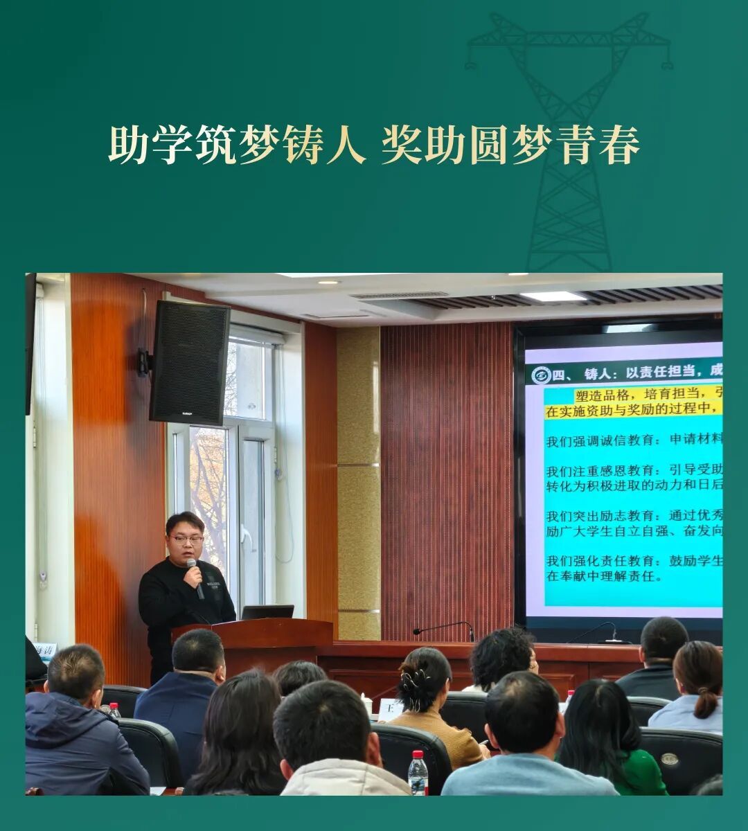 他重点分享了以奖学金和专项支持项目为核心的“发展型资助”育人实践。王伟指出,学院不仅通过助学金、励志奖学金等资助、奖励表现优秀的贫困学生,更依托校友和社会资源设立了“辽宁送变电”“满天星”“发电924”等专项资助,鼓励学生将经济压力转化为成才动力。他结合往届受助学生逆袭成才、投身电力行业基层建功立业的生动案例,说明了资助工作如何从“经济帮扶”迈向“价值引领”,真正实现“解困—育人—成才—回馈”的良性循环。最后,朝阳家庭共同观看由谢雨兵等五位校友共同发起的“满天星”资助项目专访视频。