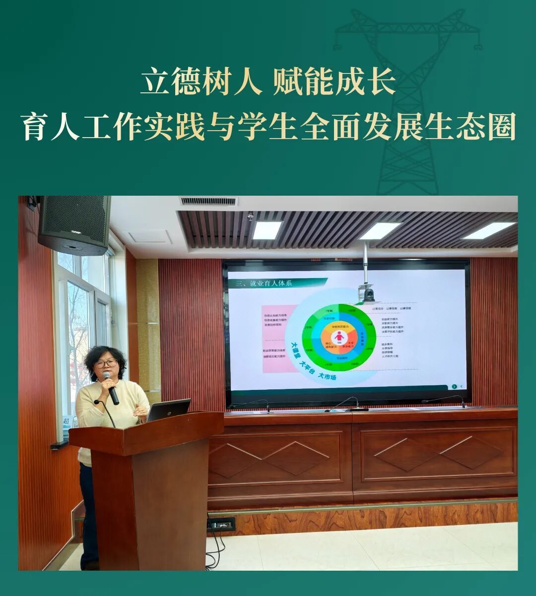 她立足“为党育人、为国育才”根本任务,系统阐述了学院构建的 “三业育人、就业育人、家校育人、从新育人”四位一体 协同育人新体系。强调通过构建 “需求前瞻-培养适配-反馈闭环-持续优化” 的动态机制,推动人才培养与区域产业升级、国家战略需求实现深度同频共振。