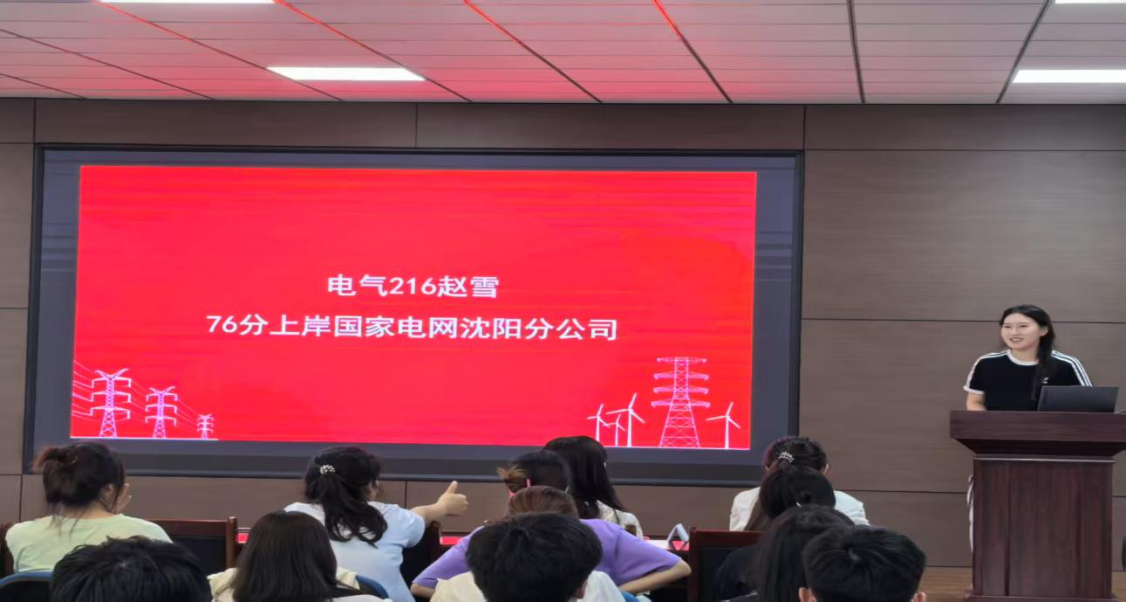 以76分的成绩考入沈阳供电公司的电气216班赵雪,介绍了当前国网的考试形式与招聘要求,鼓励同学们“以终为始、分阶段突破”,避免焦虑影响备考效率。电气213班陈钇如以70分的成绩上岸国家电网抚顺供电公司,她则系统梳理考试大纲,强调《电力系统继电保护》、《电力系统分析》等核心课程的重要性,并与大家分享了她的时间管理方法。