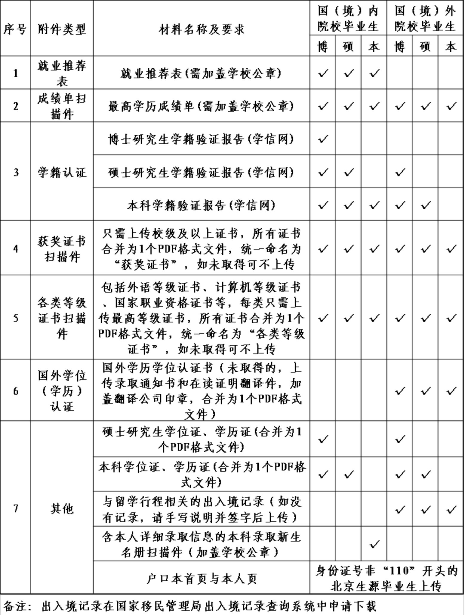 (1)国(境)内院校毕业生:须上传《教育部学籍在线验证报告》(学信网)、加盖学校公章的就业推荐表和成绩单等;本科生还需上传含本人详细录取信息的本科录取新生名册扫描件(加盖学校公章);研究生还需上传本人本科主修专业的毕业证和学位证扫描件。
